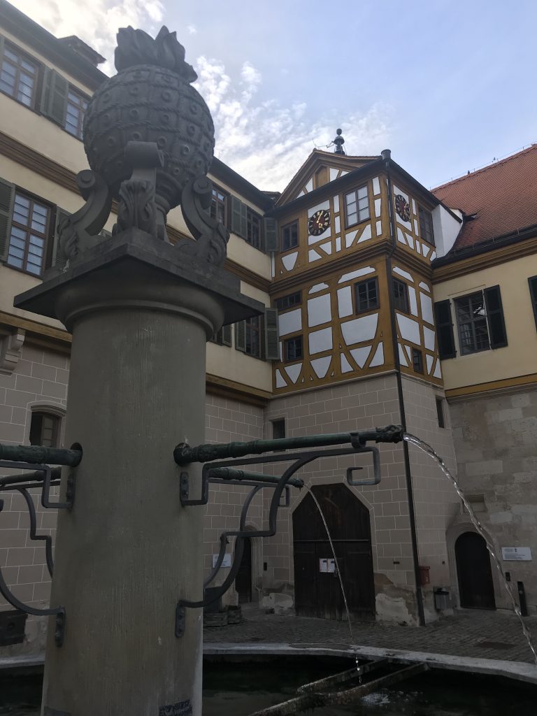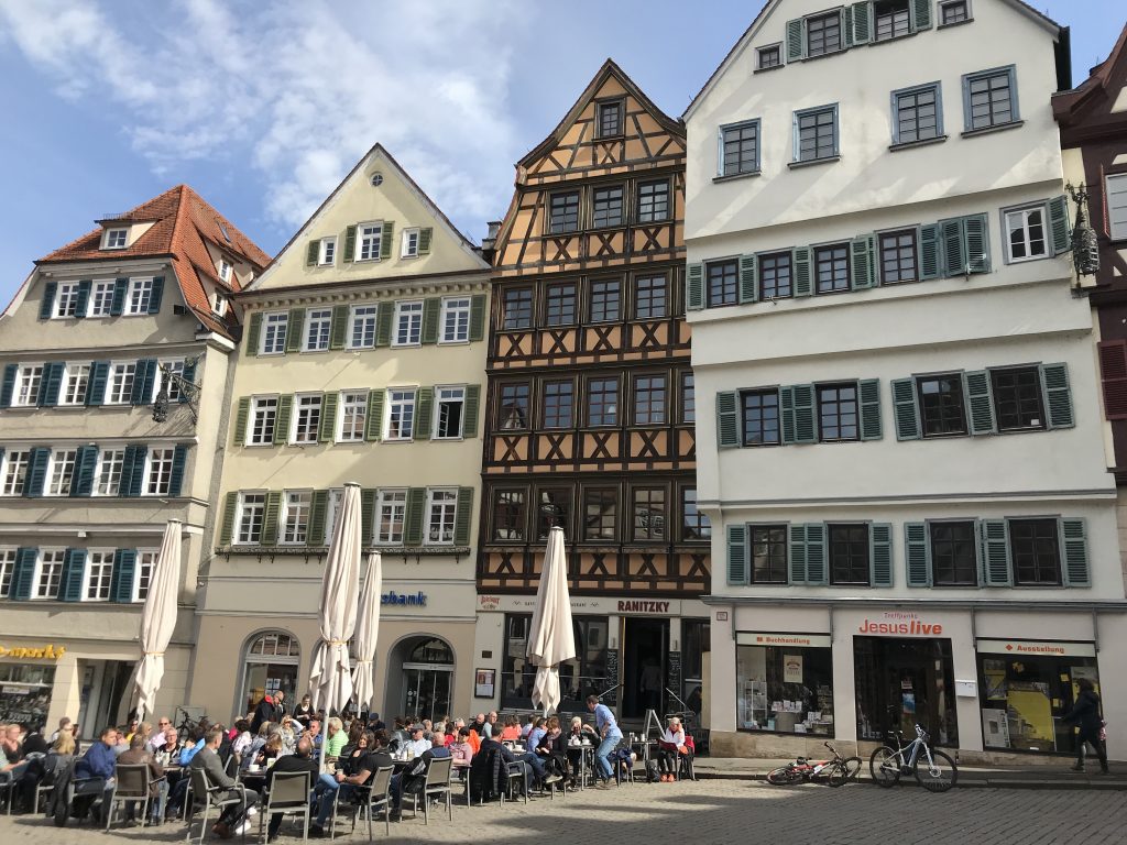 Gestärkt geht es nun los – Tübingen will erobert werden. Den Hölderlintum, direkt am Neckarufer, übersehe ich glatt. Er wird gerade renoviert und ist versteckt hinter einem Baugerüst. Dann kraxeln wir weiter die steilen Kopfsteinpflasterstraßen hinauf zur Stiftskirche.